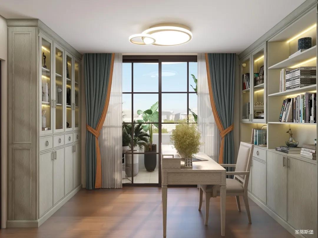 ▲書房設計不放過每一面墻,實木鋪滿整個空間,親近自然的靜謐感油然而生,陽光透過玻璃灑進來,落在地面上形成斑駁光影,一本喜愛的書、一杯咖啡、沉浸在閱讀的樂趣之中,時光荏苒、歲月靜好。