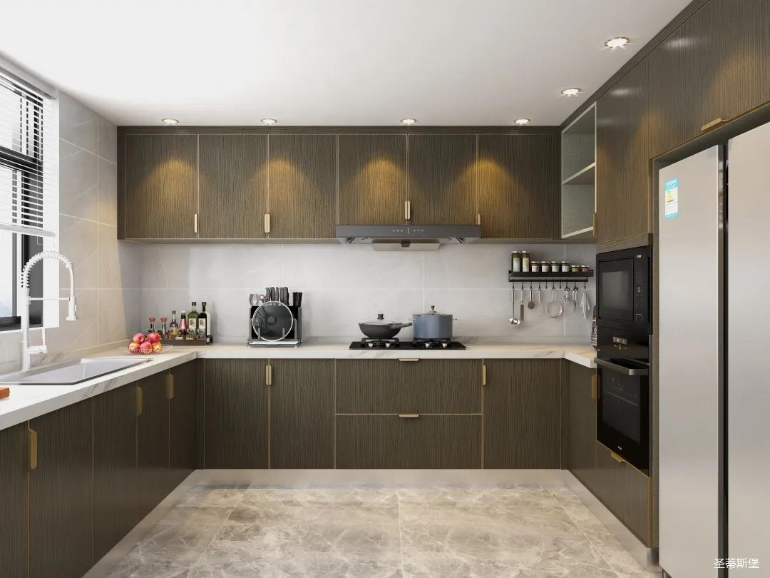 u型空間格局,設(shè)計師將功能區(qū)合理劃分,讓洗切煮一氣呵成。以米白水磨石+英倫爵士灰實木為主導(dǎo)的櫥柜系統(tǒng)中,人體工學(xué)流線,讓每一細(xì)節(jié)都折射出屋主對生活的考究,一廚一柜,每一處都關(guān)乎著我們對生活的熱忱。