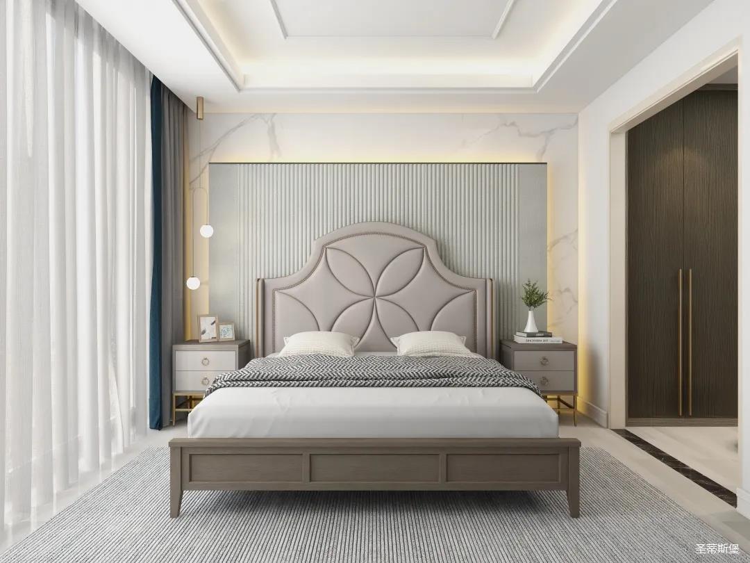 材質(zhì)的交替與光影的變換,具有濃濃的現(xiàn)代簡奢色彩。獨一無二的英倫爵士灰定制柜,由延邊鑲嵌的香檳金拉絲金屬分割,線條流暢且奢華,不僅代表著時尚,也崇尚了實木韻味。設(shè)計師將現(xiàn)代、實用、精致的藝術(shù)設(shè)計風(fēng)格應(yīng)用其中,更是精致生活方式的藝術(shù)演繹。在平靜的空間中表現(xiàn)出獨特的藝術(shù)骨感,滿足我們對精致生活的精神追求。