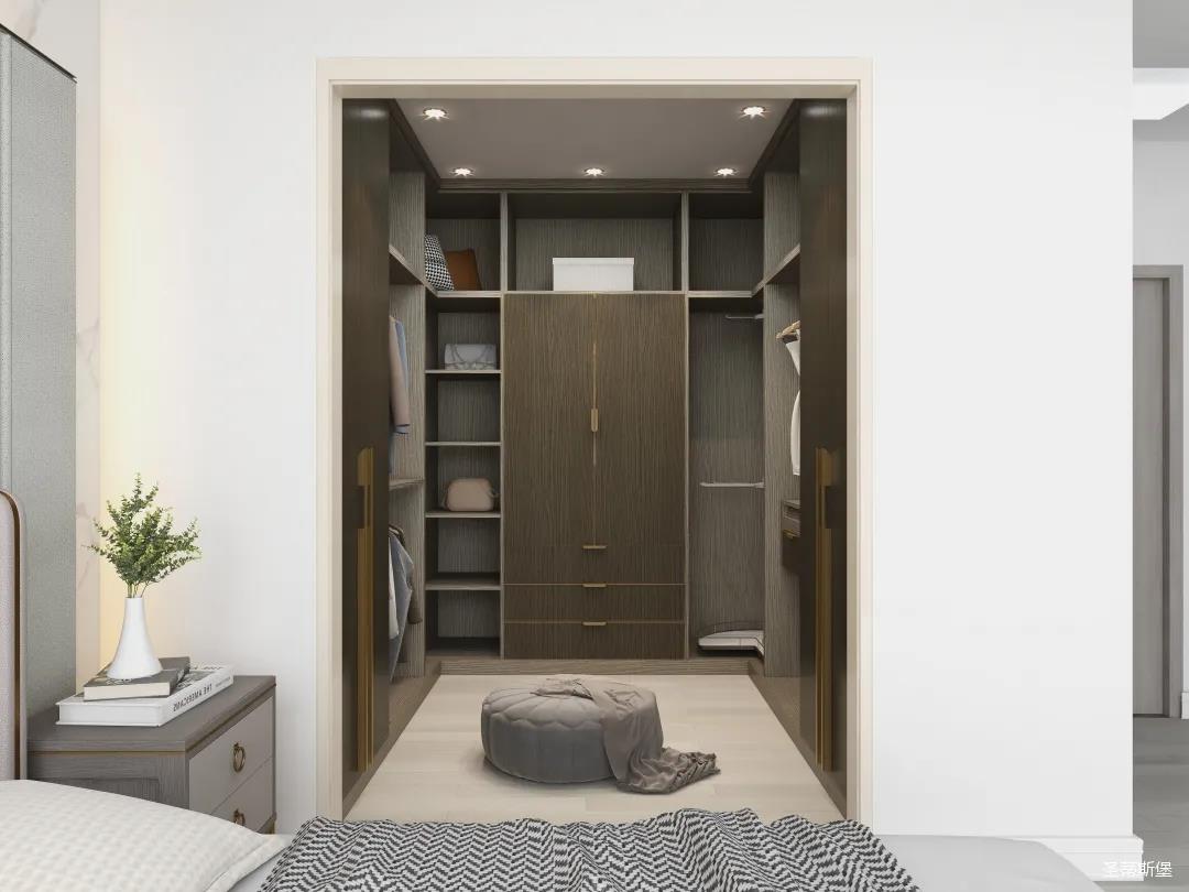 衣帽間進行u型設(shè)計,全落地定制形式,融匯了簡奢風(fēng)格獨具的浪漫與優(yōu)雅。金屬、實木拼接細(xì)節(jié)與天然材質(zhì)為衣帽間注入與眾不同的高級氣質(zhì)!開放式的懶人布局,讓衣物收納一目了然,能同時滿足疊放與掛衣功能,實現(xiàn)了“一柜多用”。