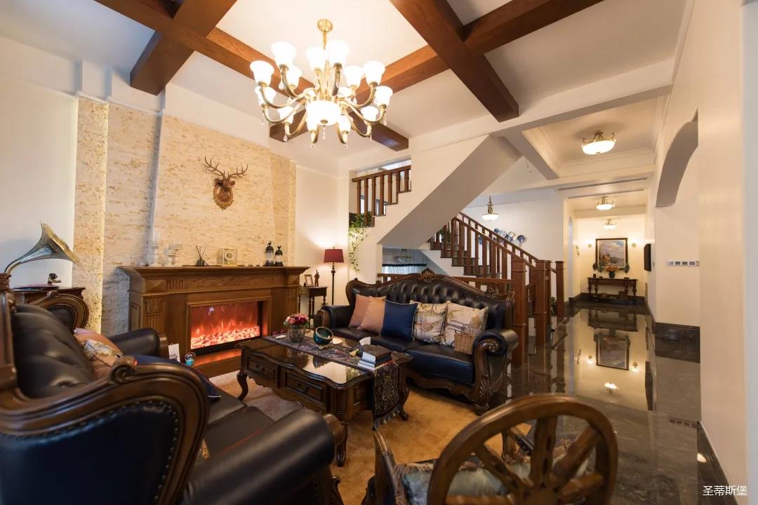 歐美實木吊頂設計,與沙發茶幾上下呼應,相得益彰,提升了空間層次感。