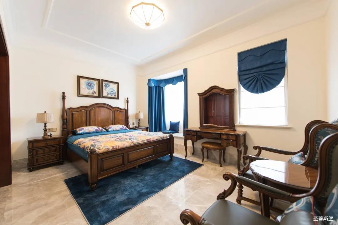 三樓是兩間臥房,每一間臥室都有自己的特定屬性。主人房端莊優雅,雍容盡顯;墻面以簡潔的美式石膏線修飾,波浪形的實木床屏上點綴著太陽形狀的手工雕花,宛如海平面上剛出升的太陽,讓整個空間色彩奔放。