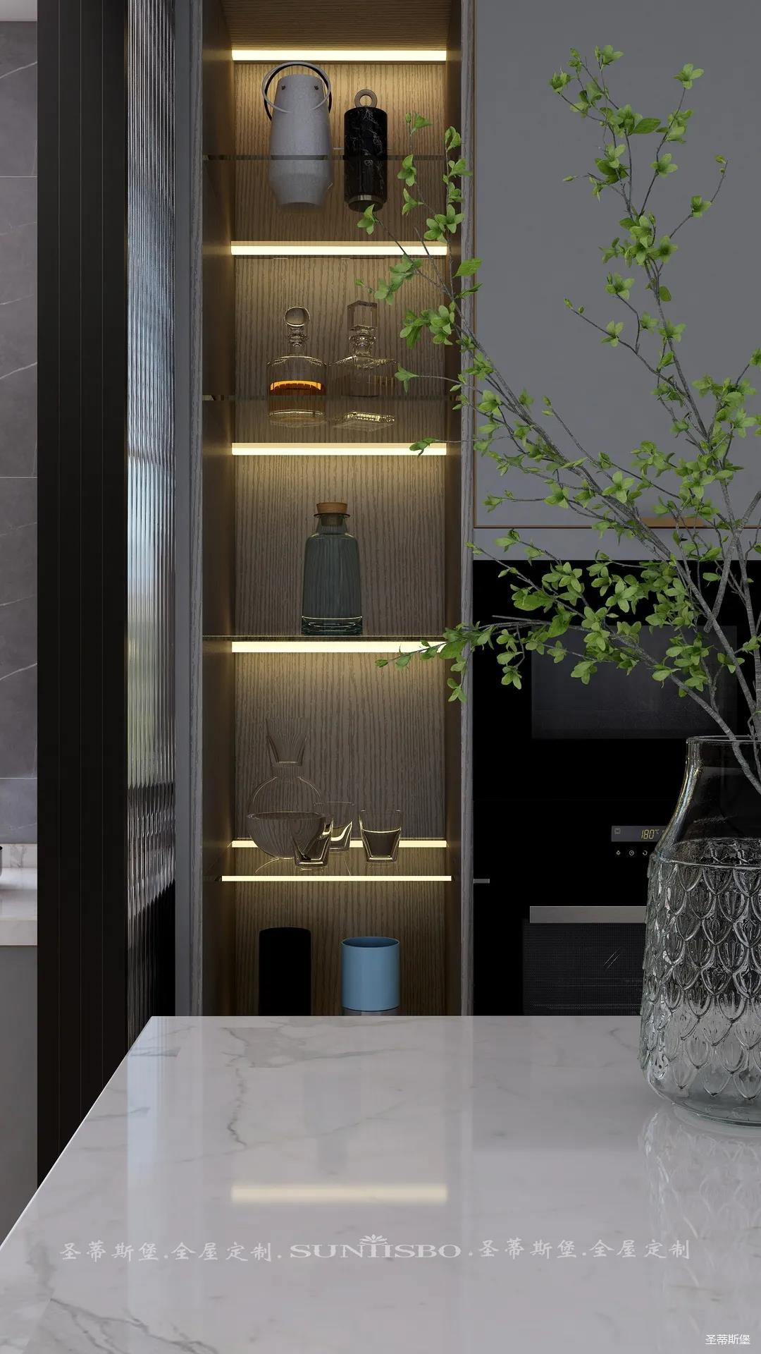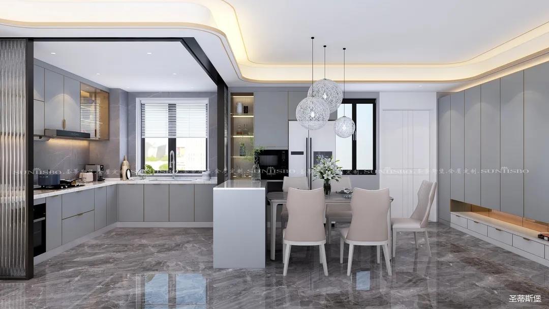 ▲英倫仿古灰的定制柜體在復(fù)古中給空間增添了一份高貴感。