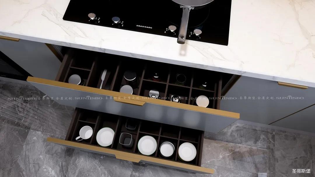廚房是獨(dú)屬我的一片小天地,設(shè)計(jì)師充分利用了材質(zhì)特性,定制高柜,根據(jù)我的用廚習(xí)慣進(jìn)行收納區(qū)域劃分,極簡大氣的外部結(jié)構(gòu)實(shí)則蘊(yùn)藏著超乎想象的大收納空間。
