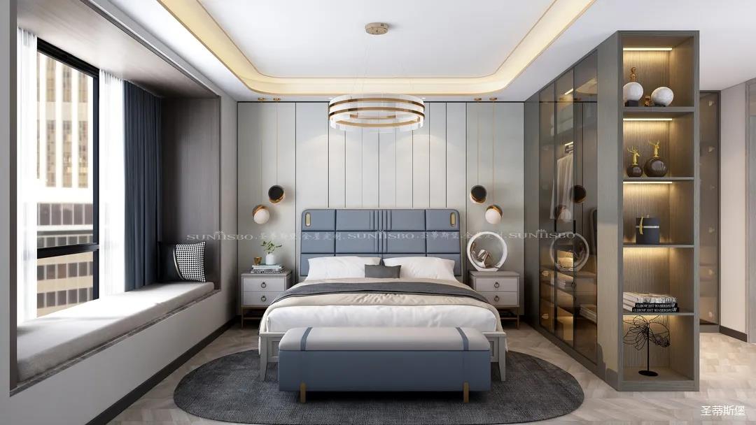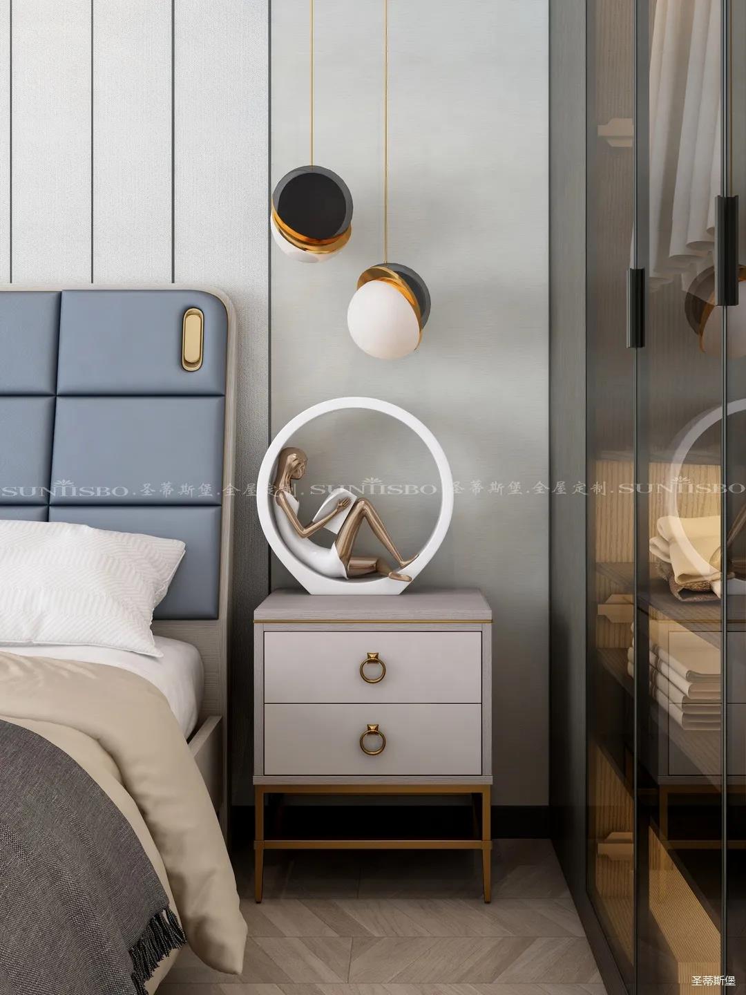 臥室的設(shè)計(jì)繼續(xù)延續(xù)著空間的高級(jí)灰,藍(lán)灰色彩的對(duì)比,讓主臥空間層次感更加豐富,充足的陽光隨意散落,空間更加溫暖大氣,對(duì)稱的球形吊燈設(shè)計(jì),恍如兩個(gè)“快樂星球”,展現(xiàn)著空間應(yīng)有的藝術(shù)性,設(shè)計(jì)師巧妙地設(shè)計(jì),營造出與眾不同的生活品質(zhì)。