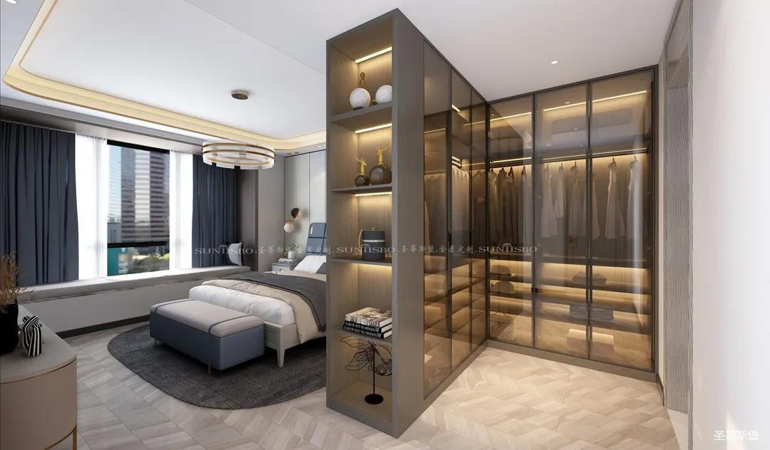 設(shè)計(jì)師不浪費(fèi)每一寸空間,將主臥的大空間劃分出一個(gè)步入式的L型衣帽間,當(dāng)即隔斷了進(jìn)門對(duì)床的尷尬,滿足了我一直以來擁有獨(dú)立衣帽間的夢想,它不僅是個(gè)收納場所,更是臥室的質(zhì)感體現(xiàn)。