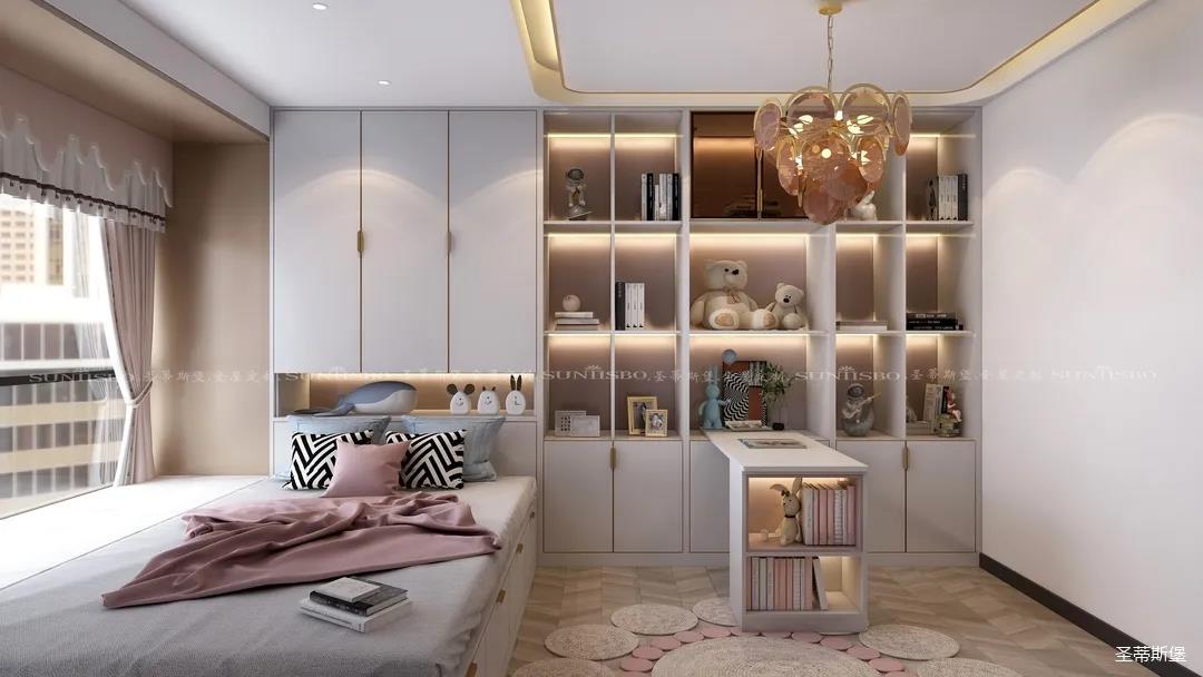 兒童房的主色調(diào)是白色,空間運(yùn)用不同程度的粉色展現(xiàn)出一個(gè)充滿童真的空間氛圍,布偶小熊,別致的兒童擺件都是對(duì)女兒活動(dòng)空間的精選,在燈光的渲染下,呈現(xiàn)出溫馨舒適的氛圍。