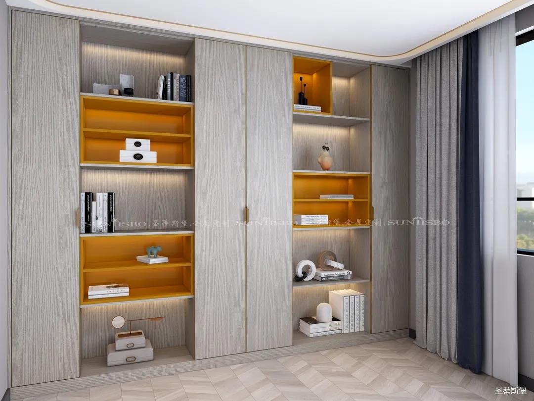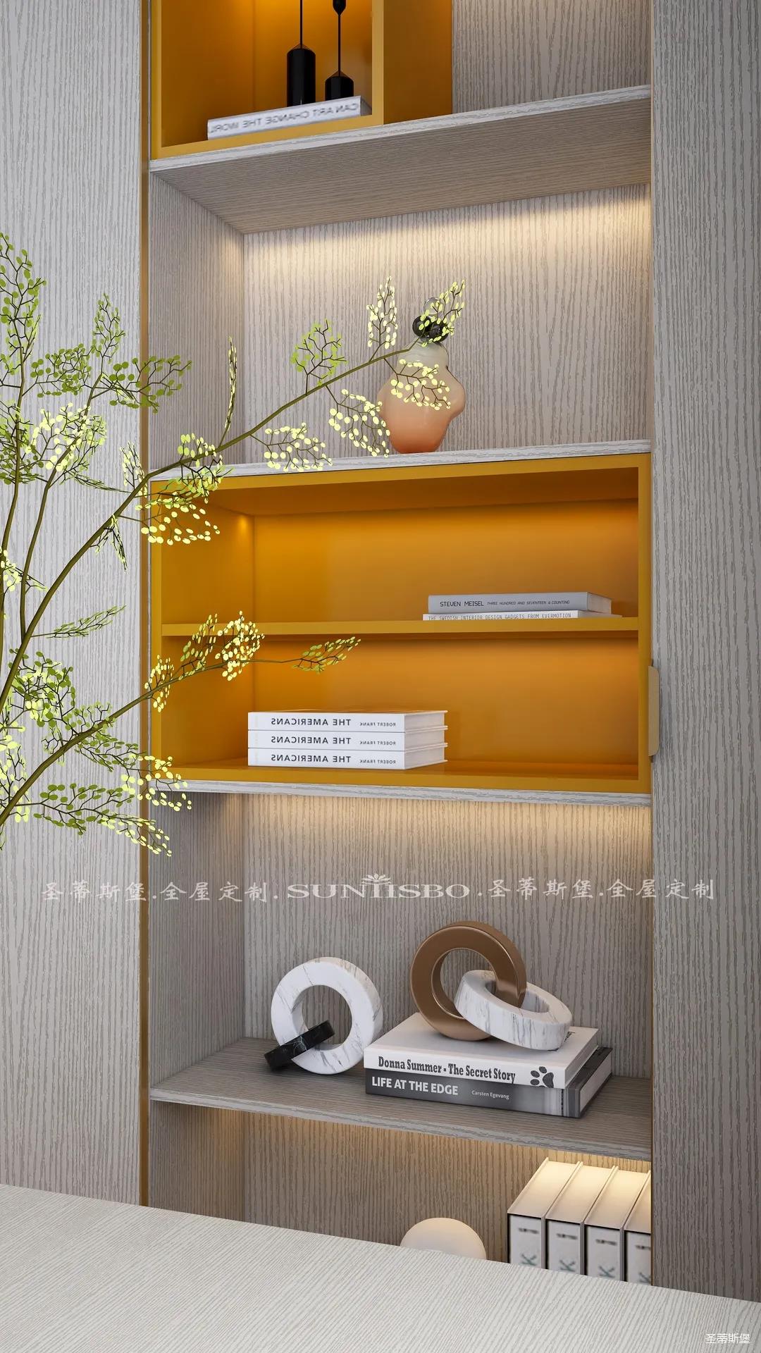 書柜點(diǎn)綴著適當(dāng)?shù)膼垴R仕橙,除了自身攜帶的高貴氣質(zhì),在聚焦視線的同時(shí),還明確了收納分區(qū)。