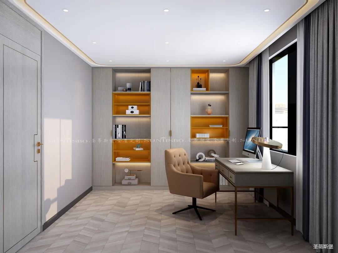 英倫仿古灰實(shí)木嵌墻書柜,結(jié)合同色系的時(shí)尚簡約書桌,整個(gè)空間都被自然氣息包圍。由于工作原因,加班也成為了生活中的常態(tài),簡約書房設(shè)計(jì)打破了平時(shí)忙碌的生活,也為心中尋得那一方心靜之地。